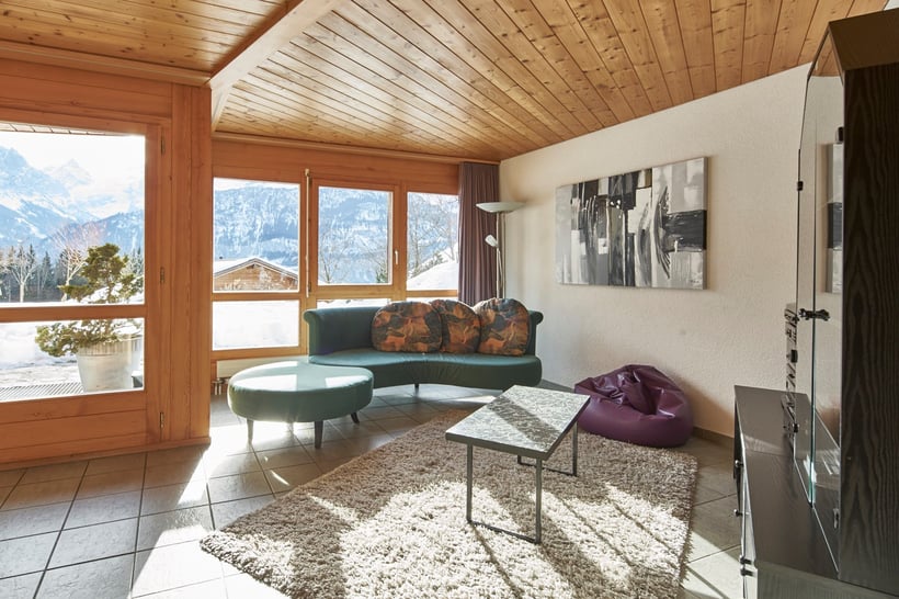 Das gemütliche und helle Wohnzimmer mit Sitzecke lädt zum Verweilen ein. Dank grossen, südseitigen Panoramafenstern bietet sich von der gesamten Wohnung aus eine einmalige Aussicht auf die faszinierende Berg- und Gletscherwelt der Berner Oberländer Alpen mit Wetterhorngruppe, Engelhörnern und Rosenlauigletscher. Zusammen mit der hellen Bauweise und Ausstattung entsteht so ein angenehmes, behagliches und freundliches Wohnklima.